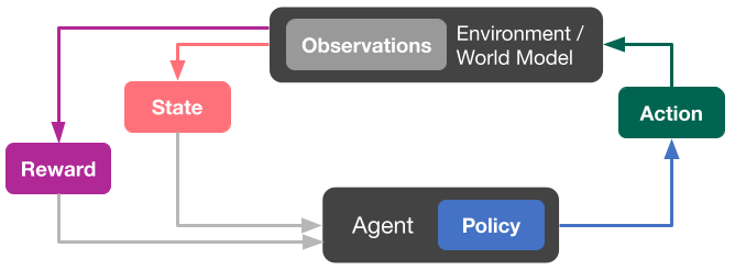 The figure above shows the standard reinforcement learning loop, where the action, in playlist generation tasks, is the track to be recommended. The environment consumes the action proposed by the agent and uses the world model (a user simulator) to transition to the new state and returns a specific reward conditioned on the action; for example, whether the user plays the track. The agent is able to see the new state and reward, using them to adapt the policy and predict the next action to pass to the environment for the next iteration. This procedure continues until the world model signals the termination of a specific sequence of states (called episode).