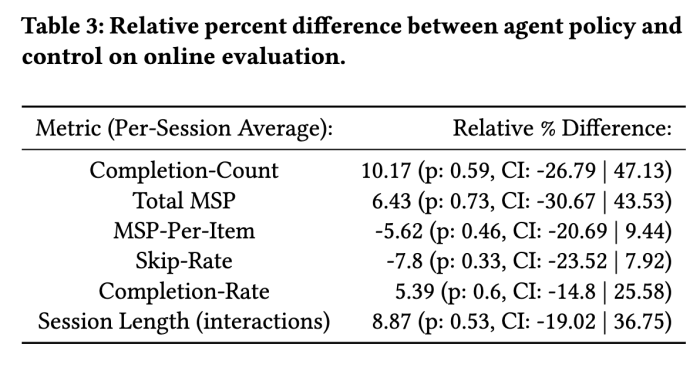 During further evaluation results, we see how both our user model ranking and the agent trained in simulation show results statistically indistinguishable from control.